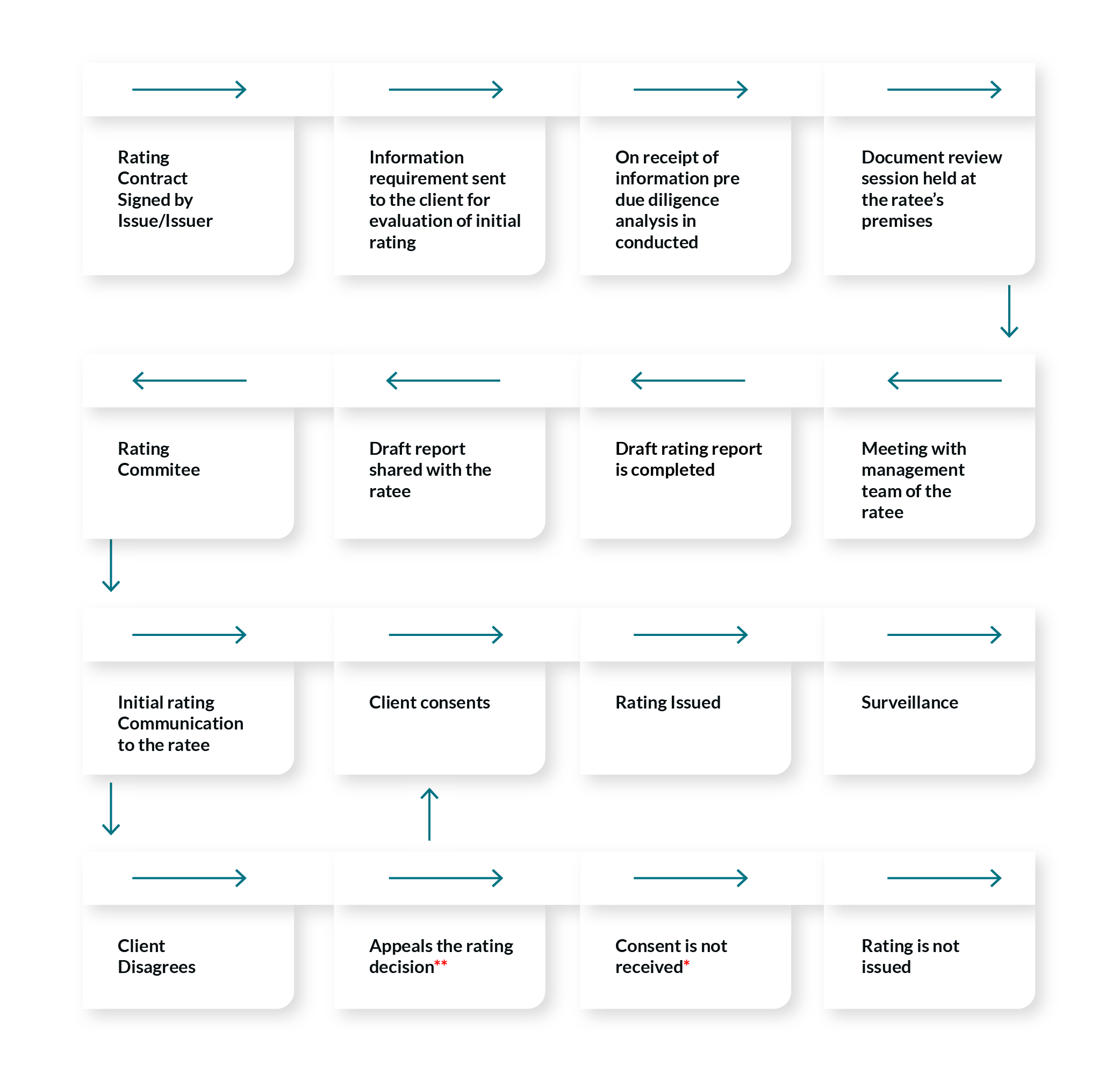** If the company believes that certain information influencing the rating was not conveyed adequately or some later developments need to be taken into consideration by the rating committee, an appeal is made within two days of the assignment of the rating. The appeal process is designed to address specific points relating to the rating decision, and hence, the appeal meeting is tightly focused. The analyst will incorporate new information into the analysis, which is then reconsidered by the rating committee. The committee may decide if the new information (to be provided within 10 days of the appeal) warrants a rating change, or it may stand by its original rating decision. The rating decision on appeal is final.